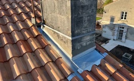Je pose et remplace tous types de gouttières (PVC, zinc, alu), avec une fixation robuste et une pente optimale pour un bon écoulement. J’assure également la mise en place ou la rénovation de chéneaux, souvent présents sur les toitures complexes, pour collecter efficacement les eaux de pluie. Pour les points singuliers du toit, comme les pieds de cheminée, j’installe des protections en zinc sur mesure, résistantes aux intempéries et au vieillissement.